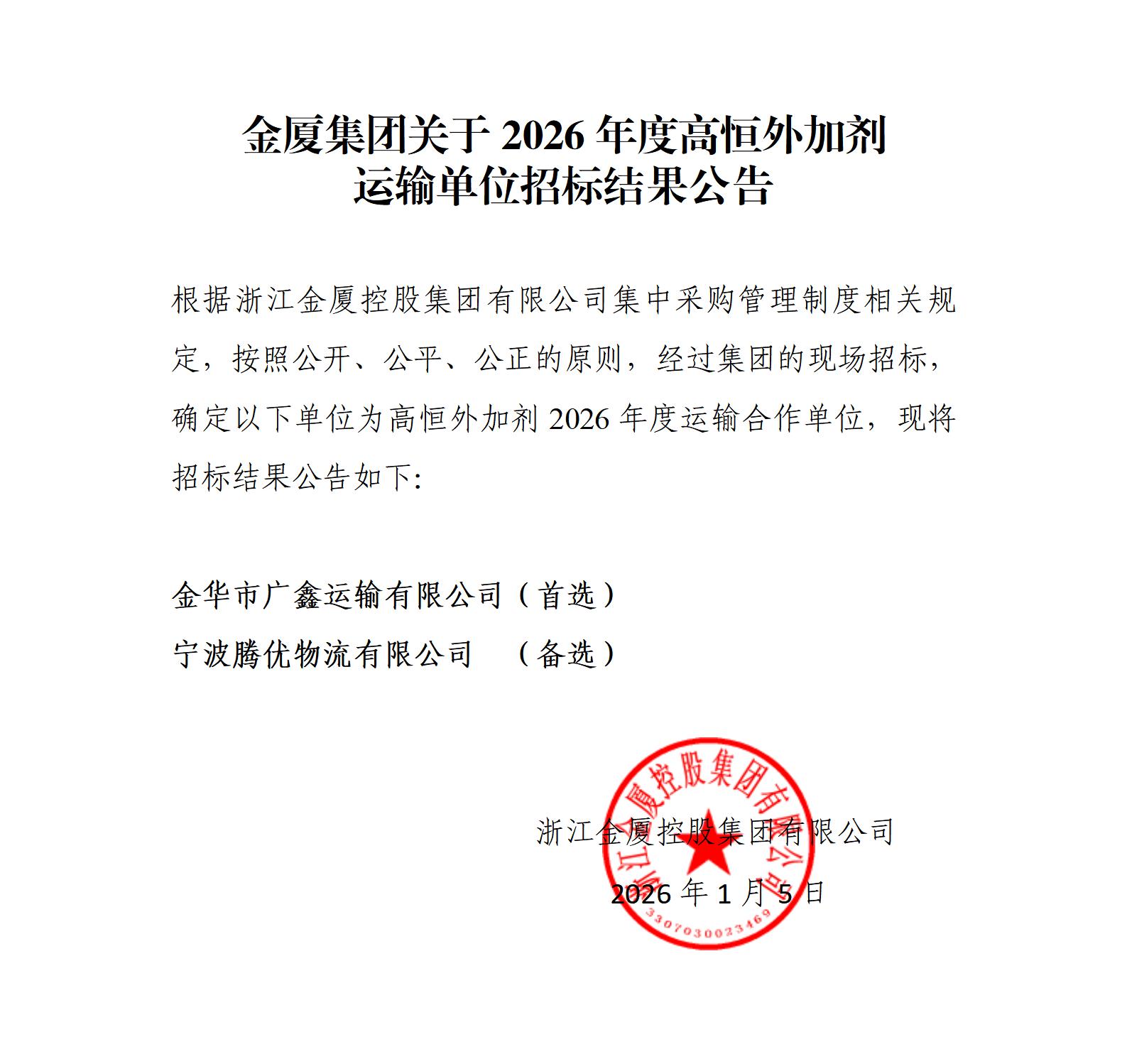 金廈集團關(guān)于2026年度高恒外加劑 運輸單位招標(biāo)結(jié)果公告